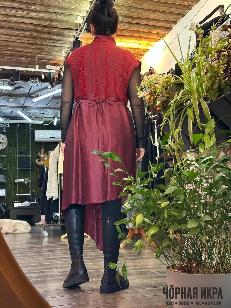 - 🍷 Многослойная конструкция — жилет и платье в одном