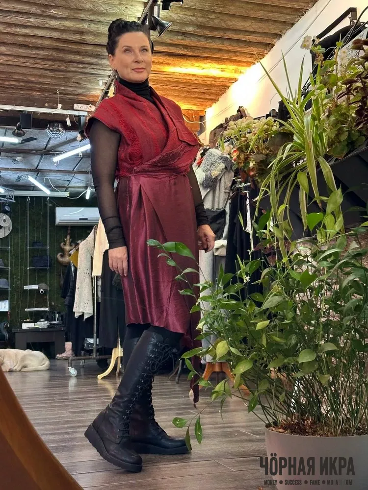 Здесь нет случайностей. Бордо работает как цвет силы и женственности одновременно. Чёрная водолазка под платьем создаёт глубину слоёв, а сапоги на шнуровке говорят: я не боюсь быть сложной.