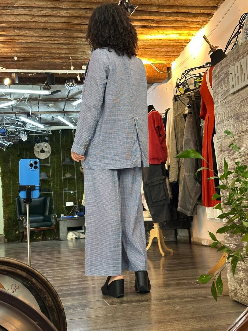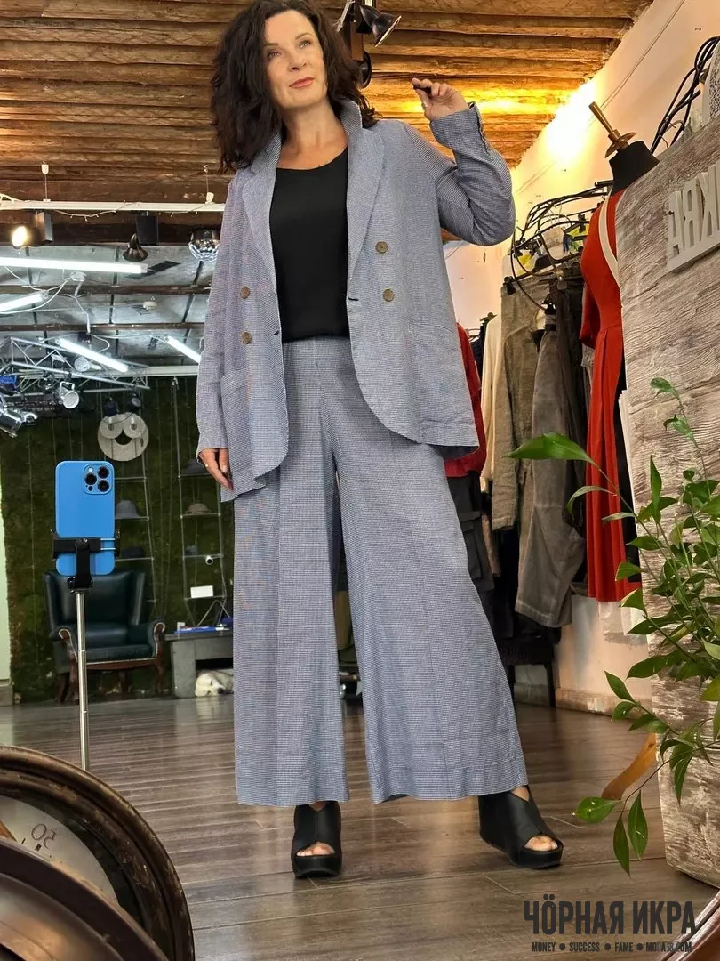 100% лен в серо-голубом оттенке — это поэзия в ткани. Жакет свободного кроя и широкие брюки создают силуэт, который говорит: «Я знаю себе цену, и она не измеряется степенью стеснения движений».