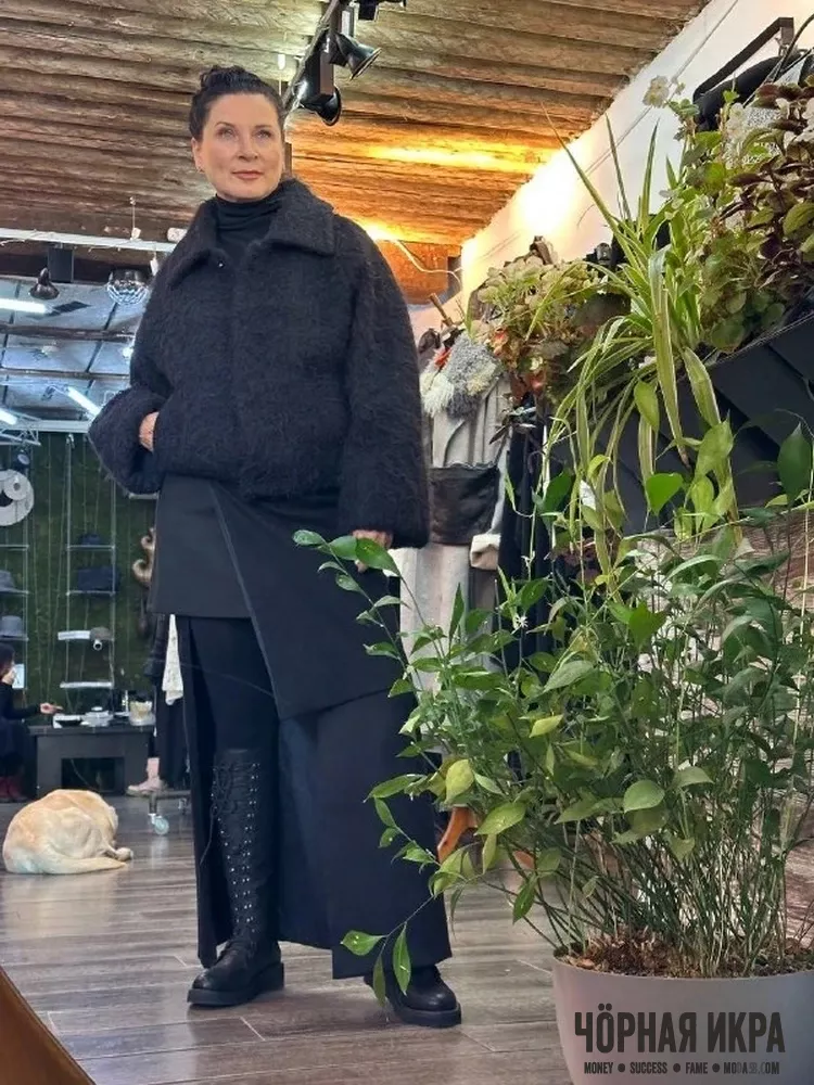 Здесь нет цветовых конфликтов — только чёрный в разных текстурах. Альпака в куртке говорит о премиальности через мягкость. Асимметрия юбки подтверждает: красота может быть неожиданной.