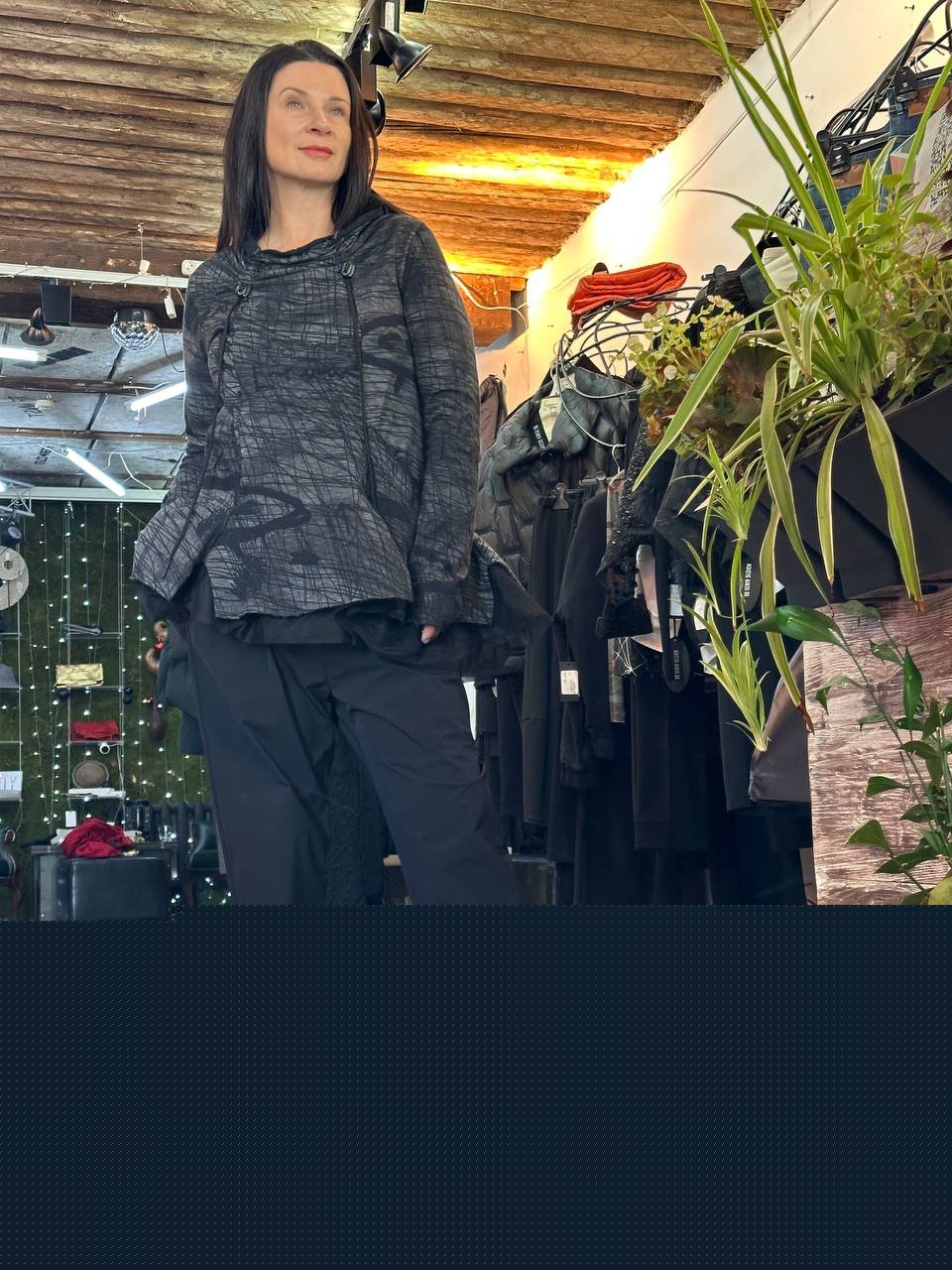 Здесь принт не украшает — он определяет. Графические линии на топе работают как урбанистическая карта, а чёрные брюки служат нейтральной основой. Это образ для тех, кто понимает: красота может быть геометричной.