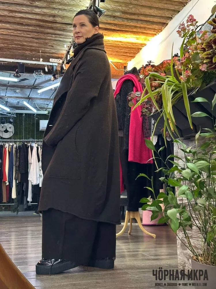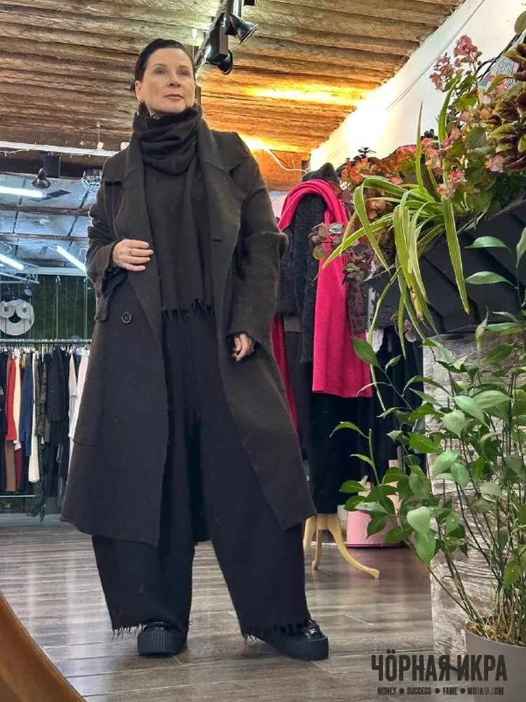 - 🧥 Чёрный цвет пальто работает как рамка для всего образа