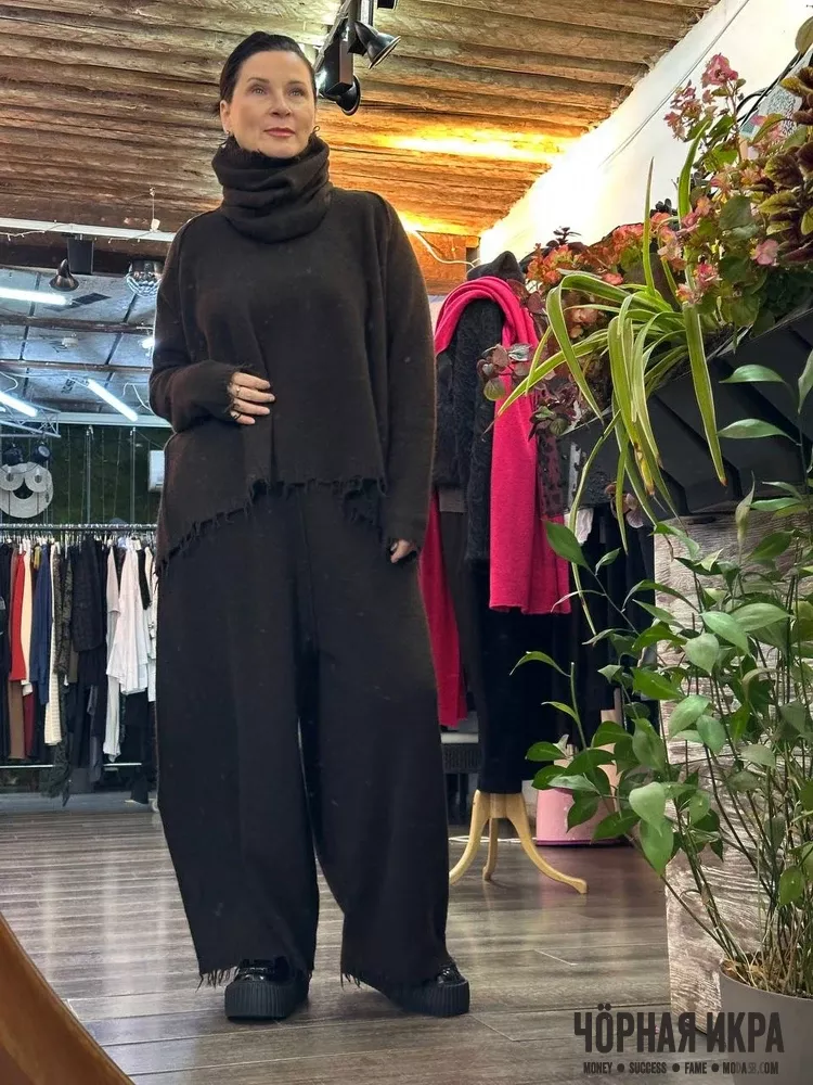 Здесь нет цветовых конфликтов. Только чёрный, чёрный и чёрный. Но это не мрачность — это глубина. Пух лисы в трёх элементах создаёт тактильное единство. Як в пальто добавляет структурную честность.