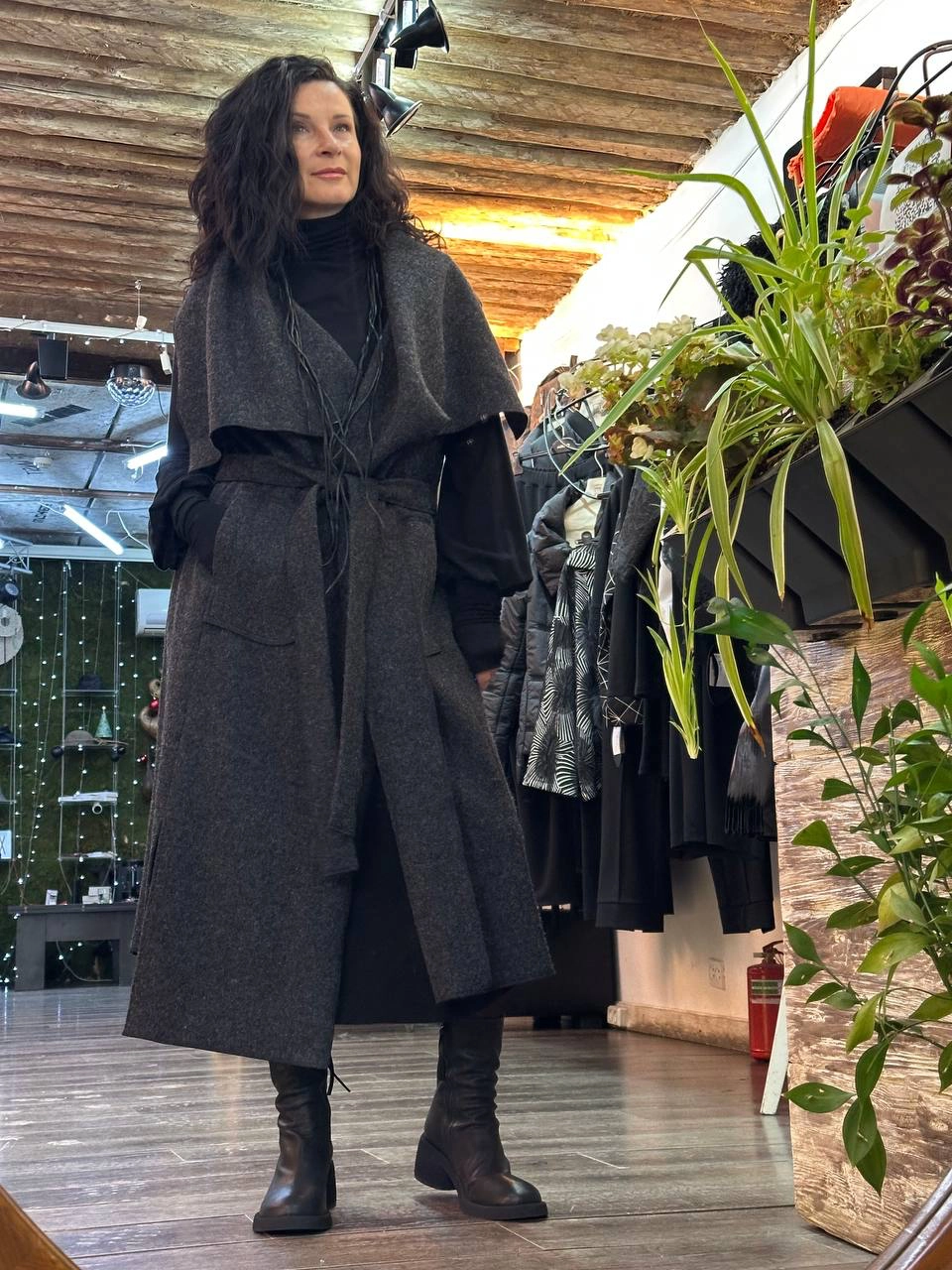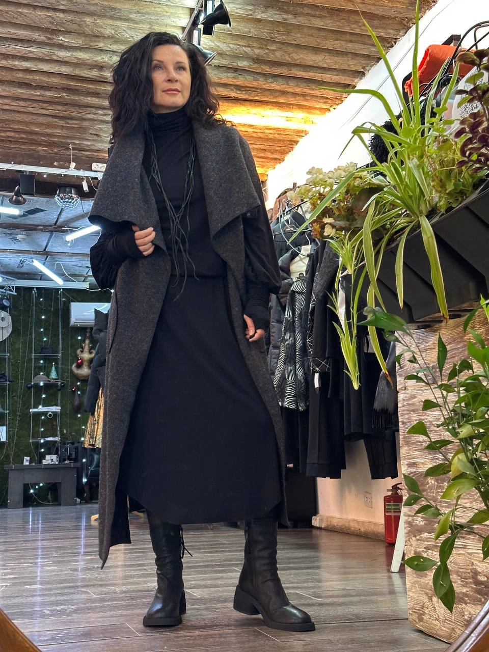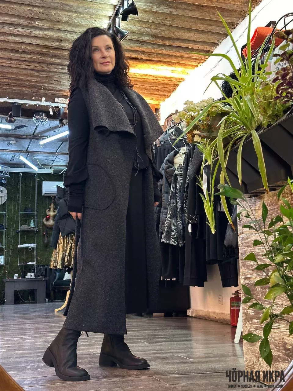 Центральное место занимает жилет от хорватского бренда Xenia Design. Выполненный из 100% шерсти, он обладает четкой формой и служит идеальным структурирующим элементом. Основой образа стало эластичное трикотажное платье, создающее мягкий силуэт «второй кожи». Финальный штрих — кожаный аксессуар от Julia Fom, который превращает лаконичный комплект в объект современного искусства.