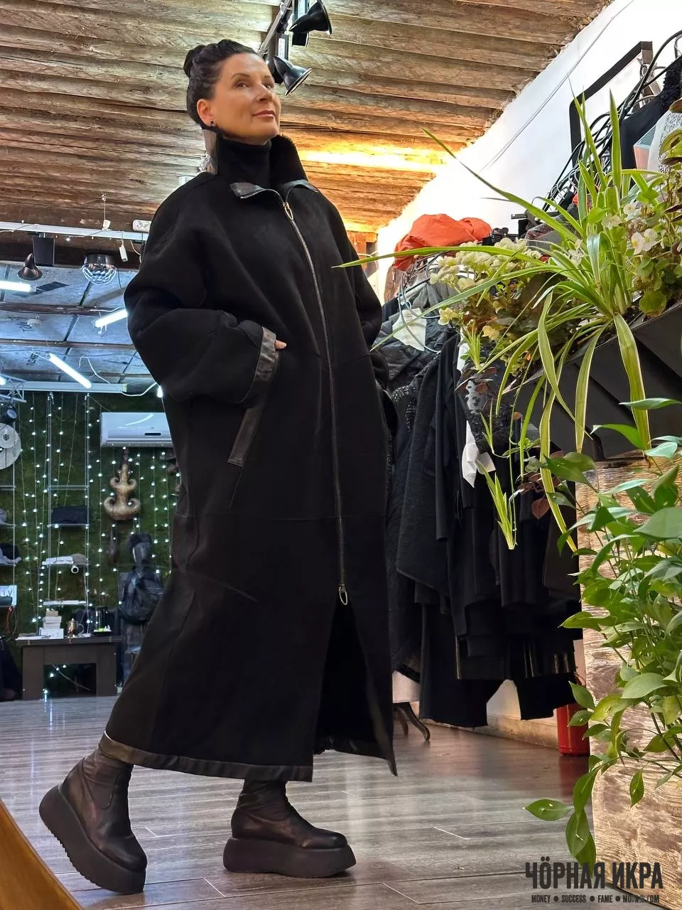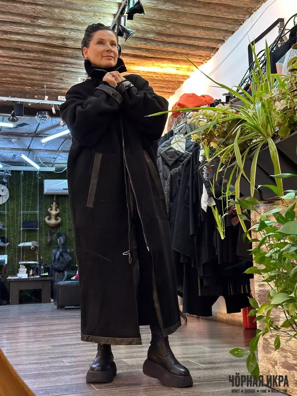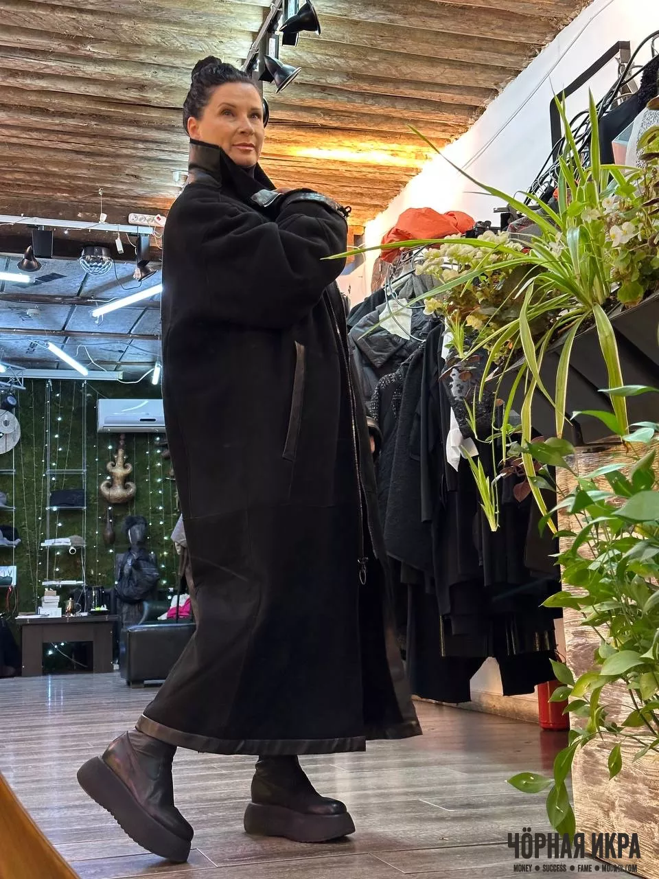 Чёрная овчина с графитовыми кожаными вставками создаёт контраст текстур, который читается как диалог между мягкостью и строгостью. Объёмный воротник-стойка, асимметричная молния, глубокие карманы — каждая деталь продумана до молекулярного уровня 🌑