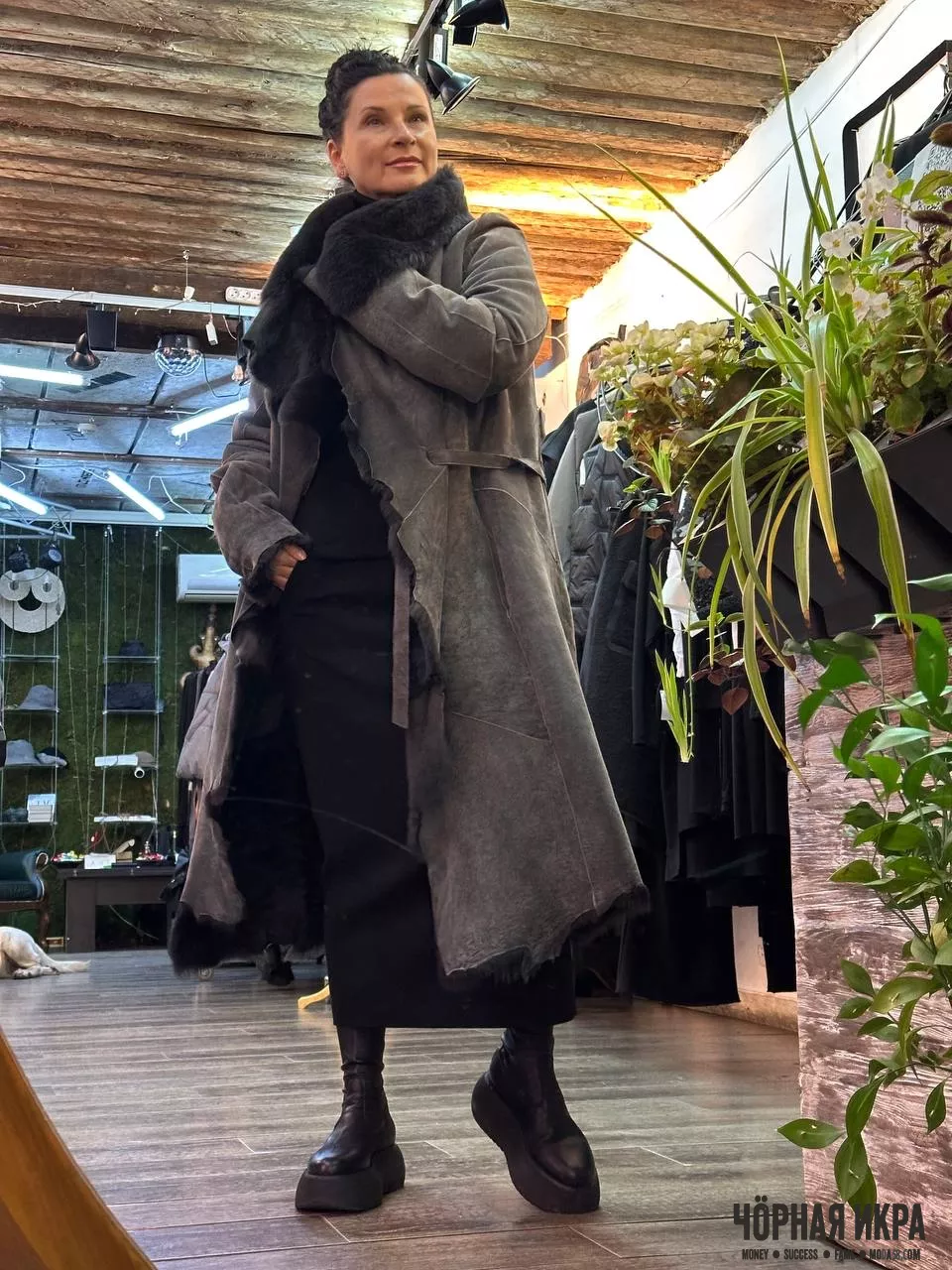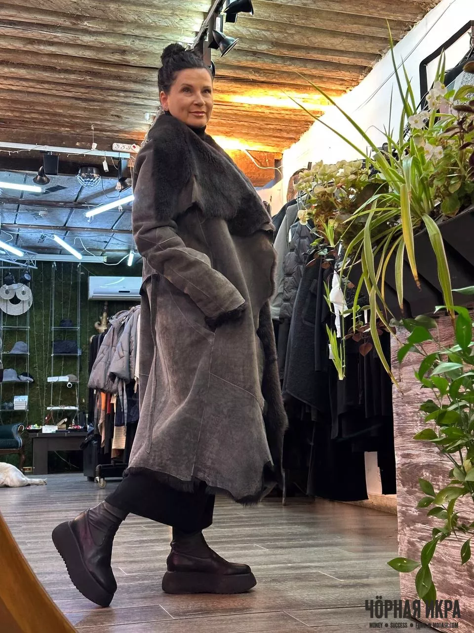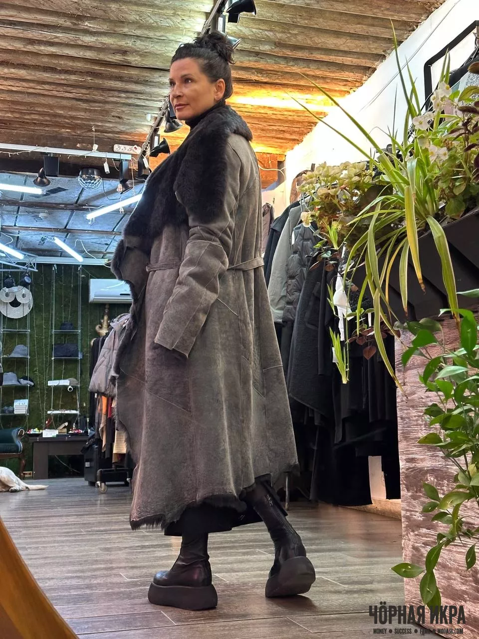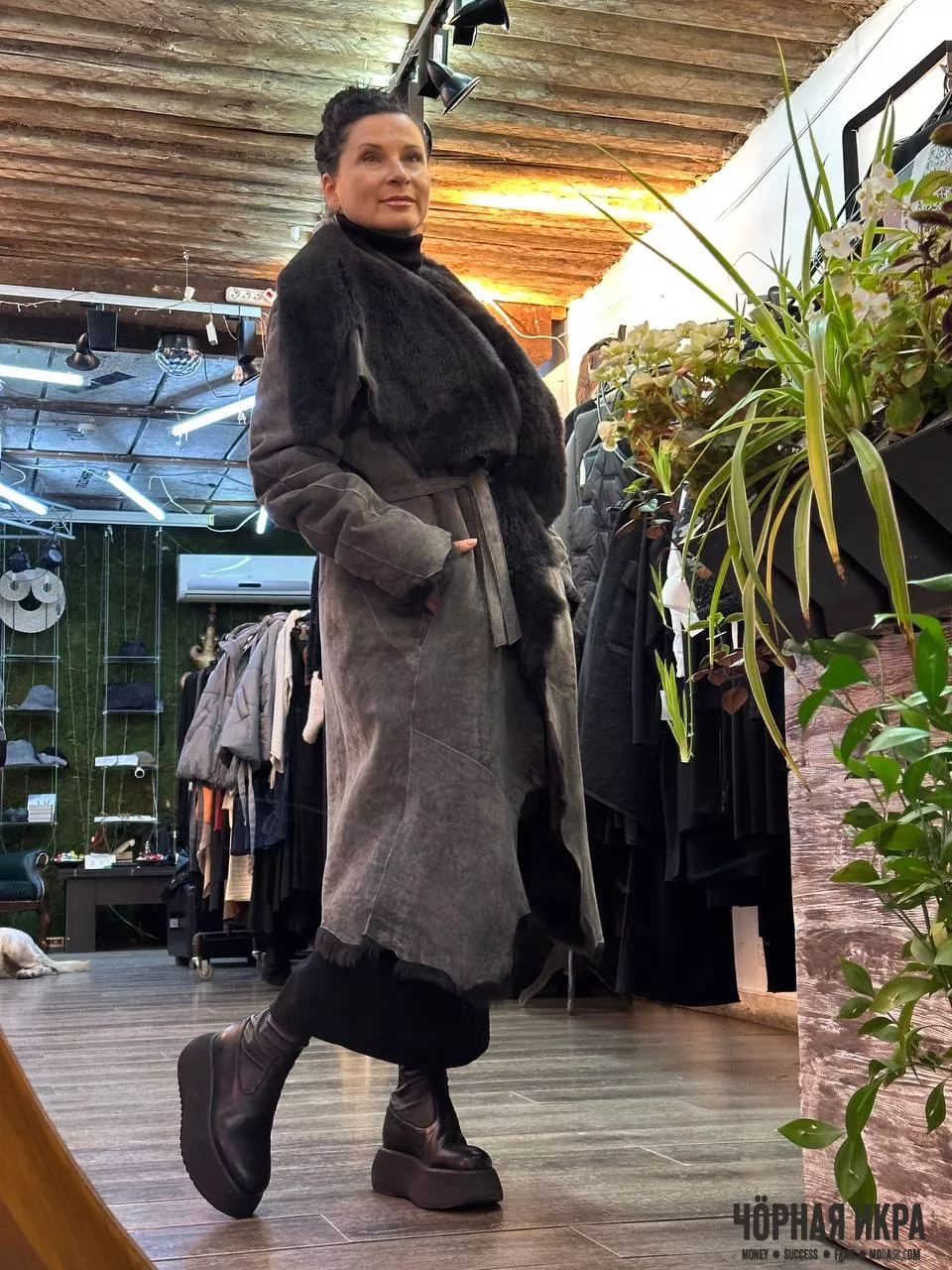 Размер 42 (российский 44-46) создаёт силуэт, где объём не подавляет, а защищает. Графитовая замша снаружи, густой чёрный мех внутри — это диалог между суровостью и нежностью. Асимметричные лацканы, пояс, который можно завязать или оставить свободным, глубокие карманы — каждая деталь продумана как ответ на вопрос о настоящем тепле 🌑