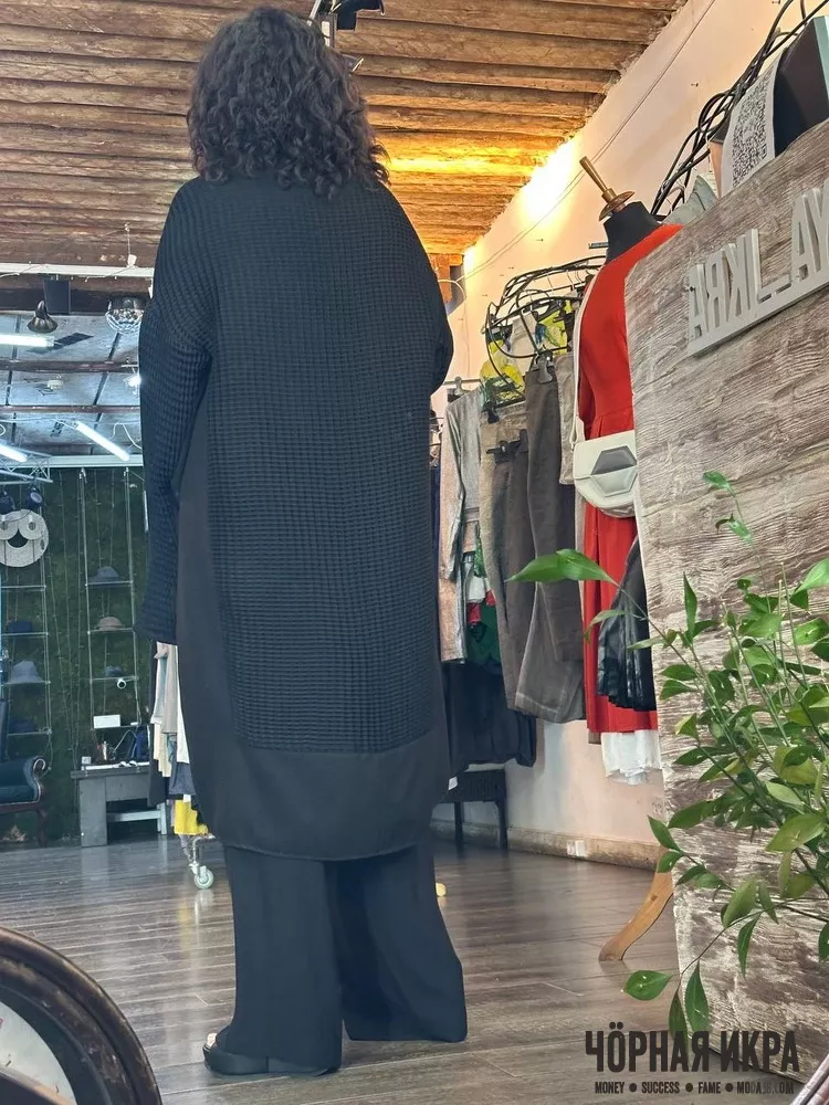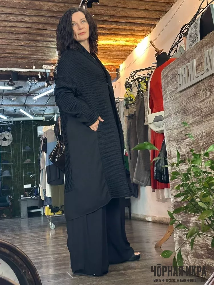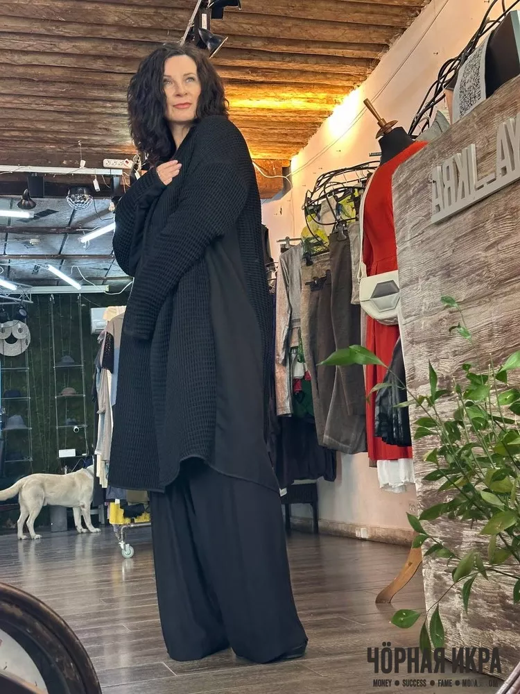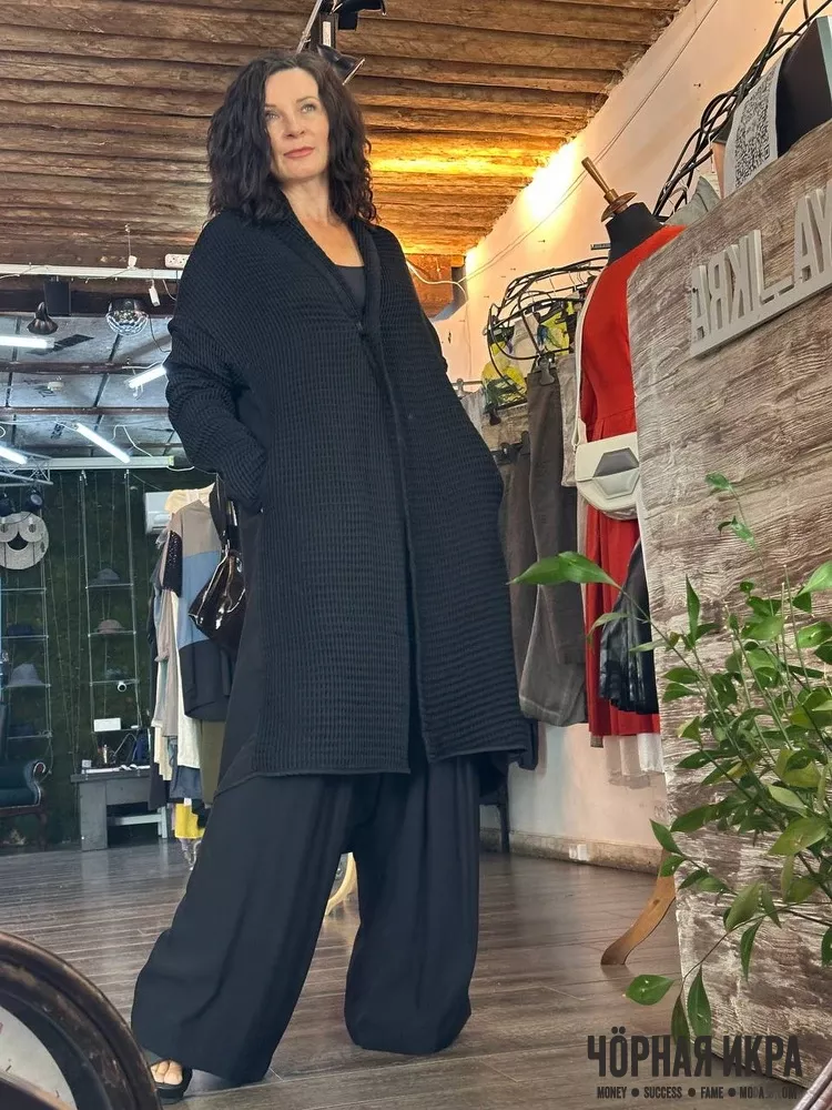 Этот образ — *манифест осознанной драматичности. Сочетание хлопка и шерсти (55% на 45%) рождает текстуру, которая меняется с каждым движением. А брюки из штапеля от *«Чöрной икры»* — наш собственный *хит интеллектуального гардероба.