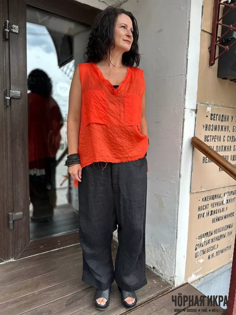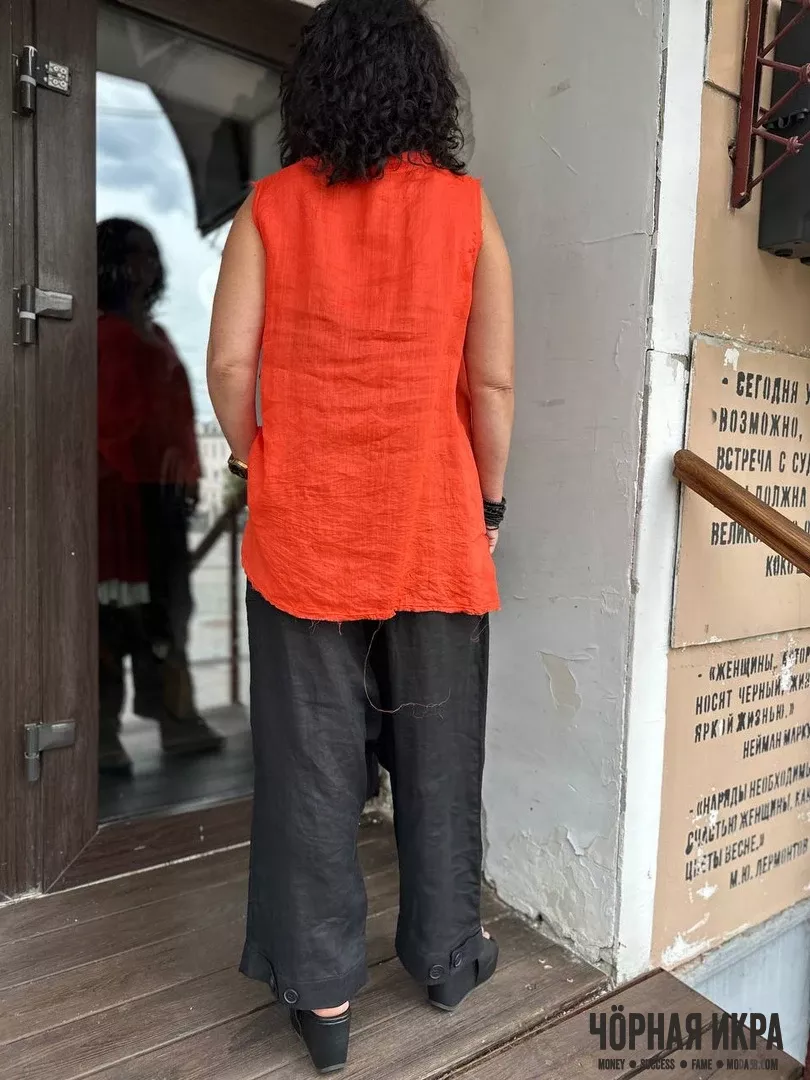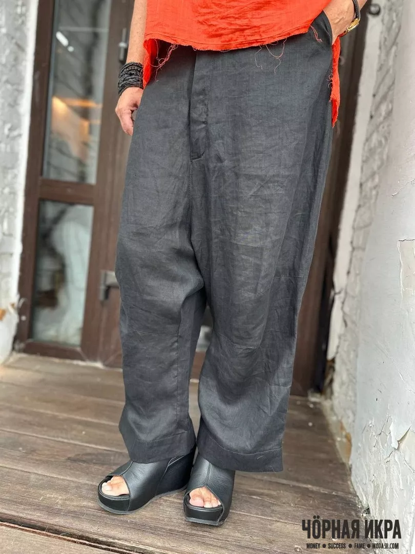 Брюки из 100% льна – классика жанра для знойного лета. Широкий крой не сковывает движения, а благородная мятость льна добавляет образу непринужденной элегантности. Размеры: 42-44 российский.
