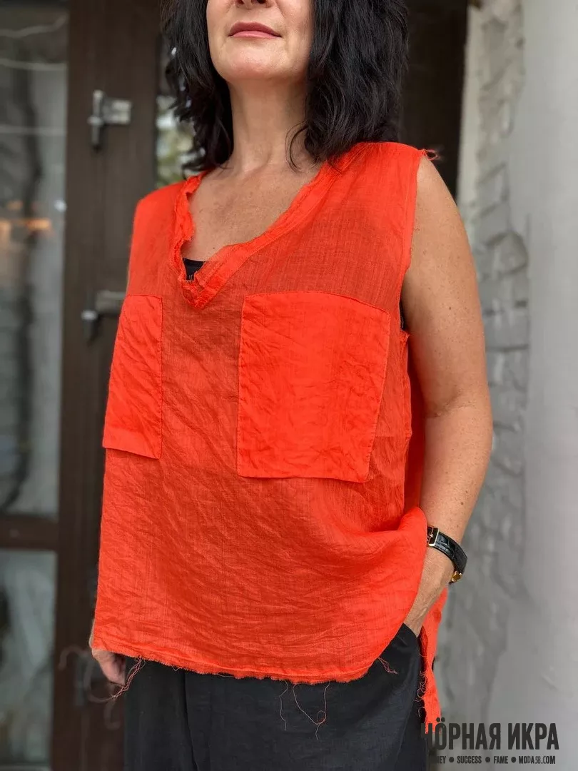 Легкий топ из смеси лен/шелк – это союз природной текстуры и благородного блеска. Натуральные волокна обеспечивают идеальную терморегуляцию в жару, а свободный крой создает воздушный силуэт. Универсальный размер OS подходит на российские размеры 44-48.