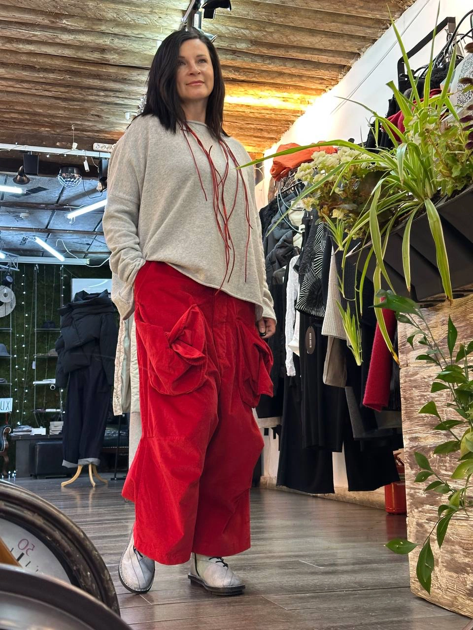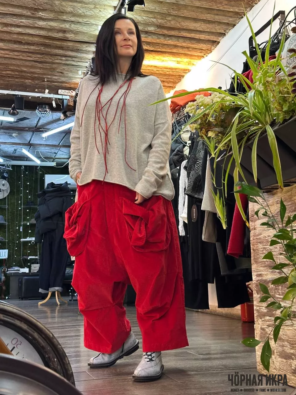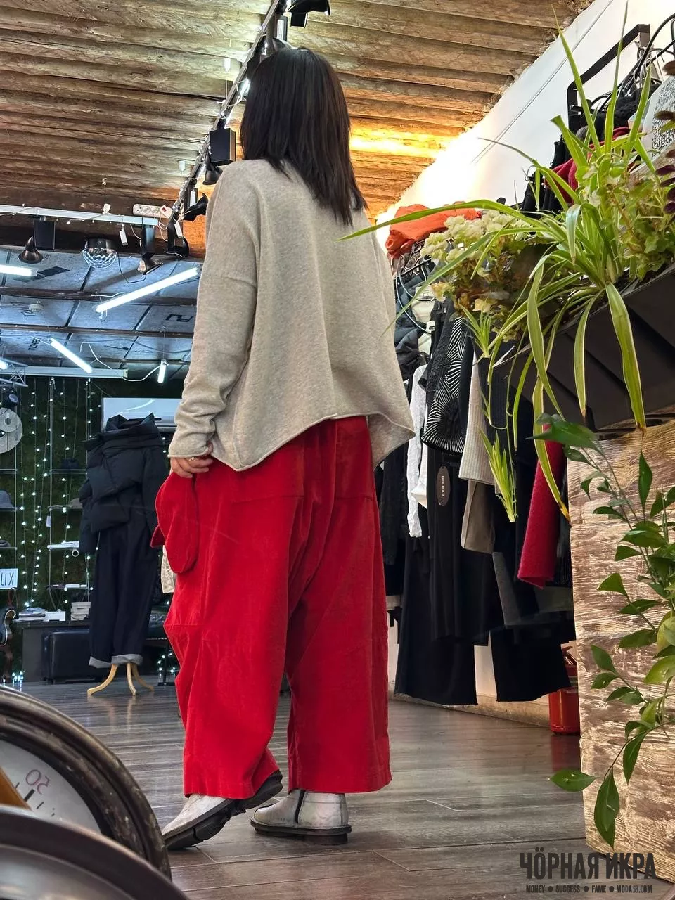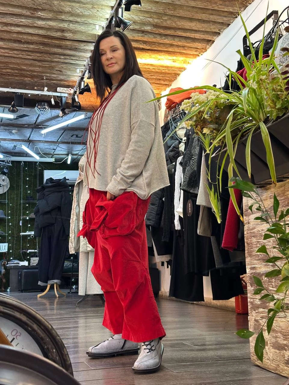 В центре внимания — архитектурные брюки от Studio Rundholz. Их глубокий красный цвет и объемный крой с накладными карманами создают идеальный баланс между авангардом и комфортом. Верх — лаконичный свитер от La Vaca Loca, чей состав (меринос + кашемир) ощущается как нежное объятие.