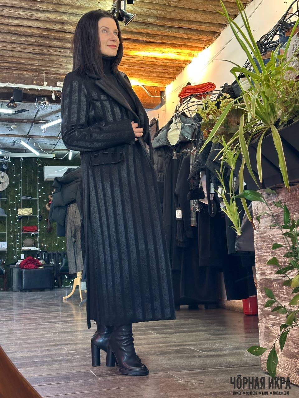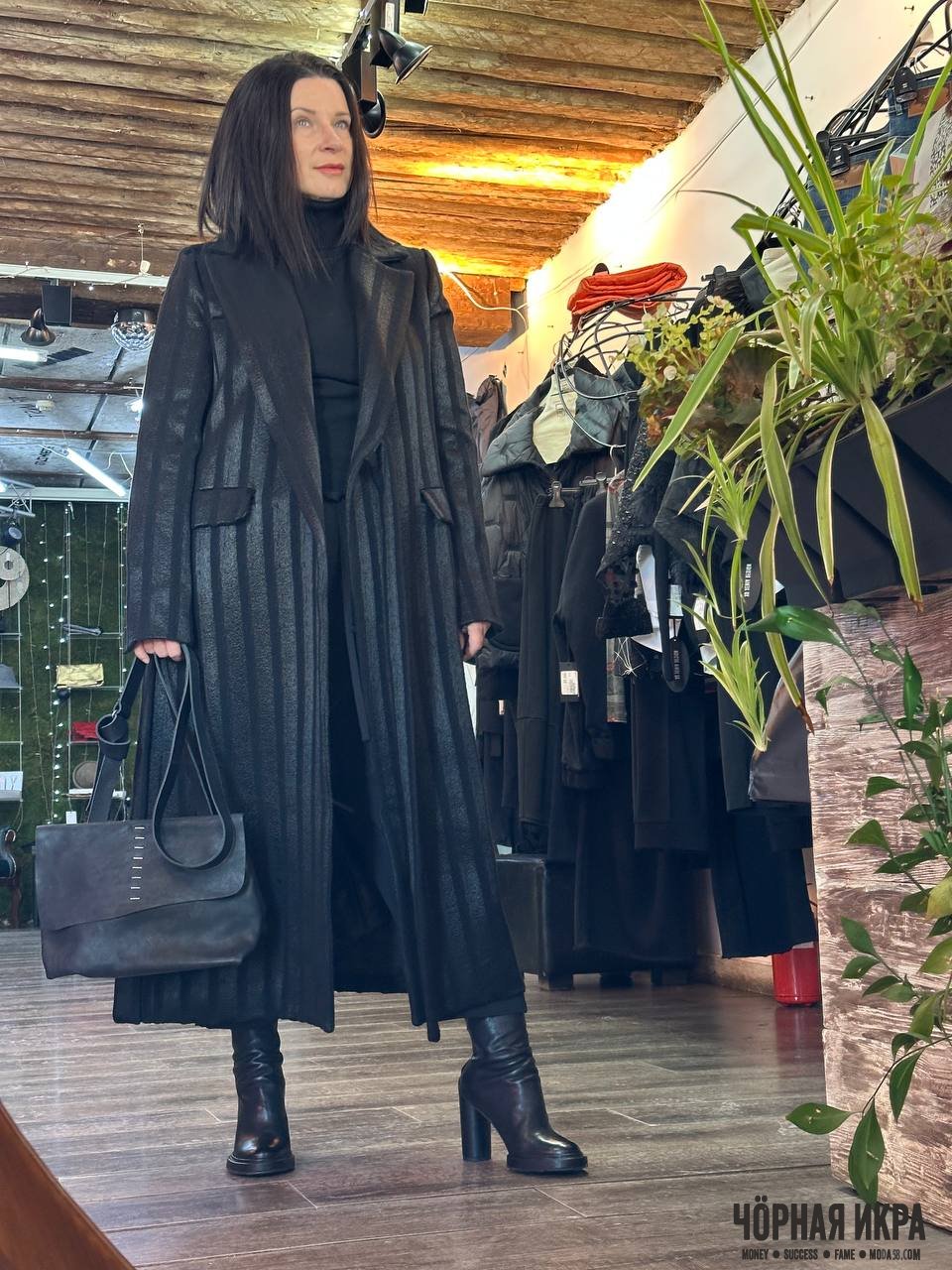 Пальто чёрное, длинное, с полосами, которые делают силуэт загадочным и строгим одновременно.