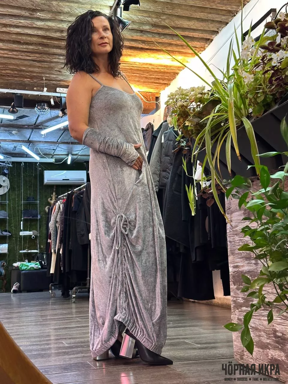 В концептуальной моде форма всегда следует за смыслом. Сегодня мы представляем образ, который превращает повседневность в перформанс. Платье от итальянского бренда Andrea Ya’aqov — это исследование объема и мягкости. Сочетание вискозы и нейлона создает текучую фактуру, которая адаптируется к вашим движениям, а необычный крой подола и высокие митенки добавляют образу футуристичности.