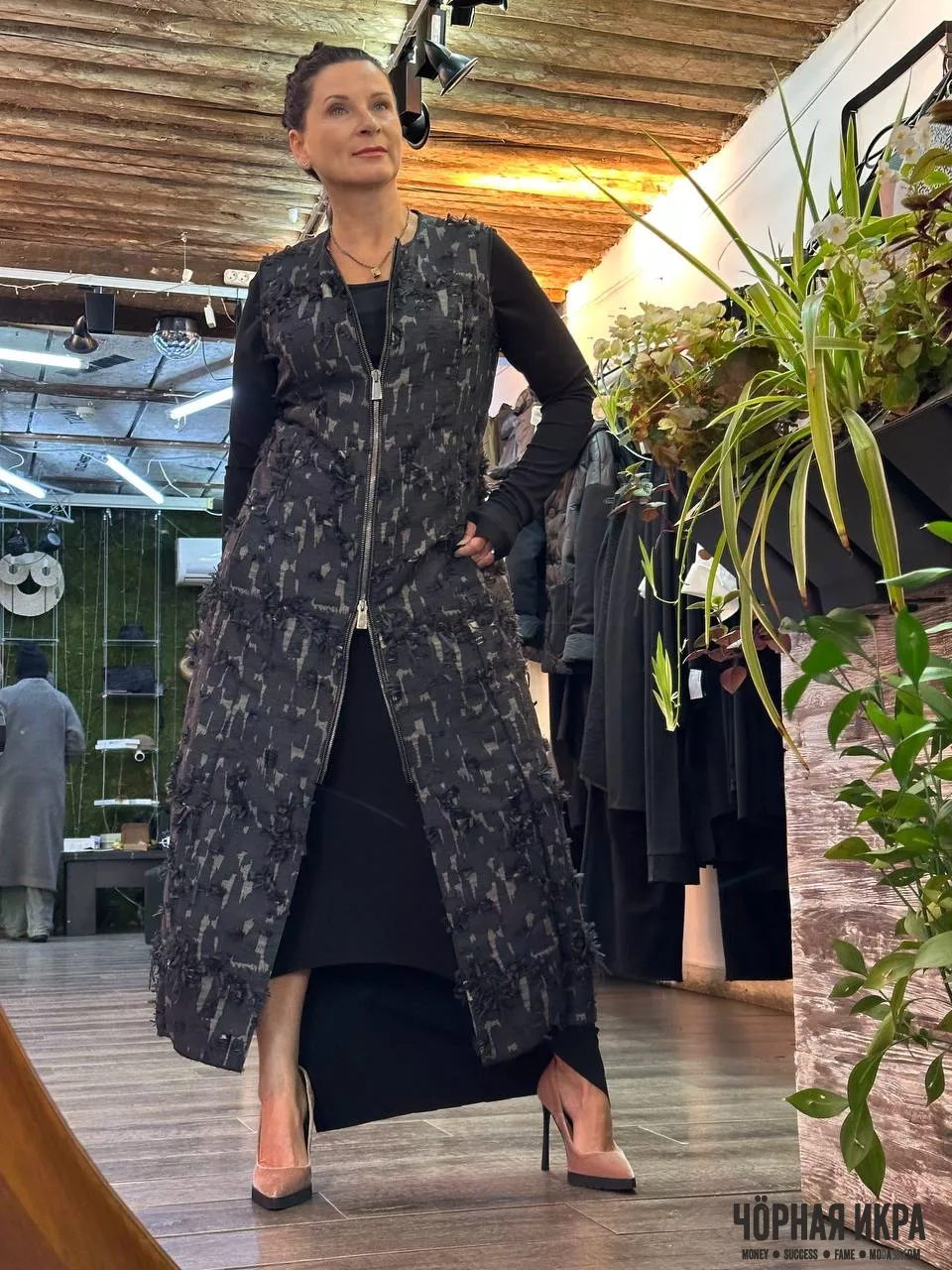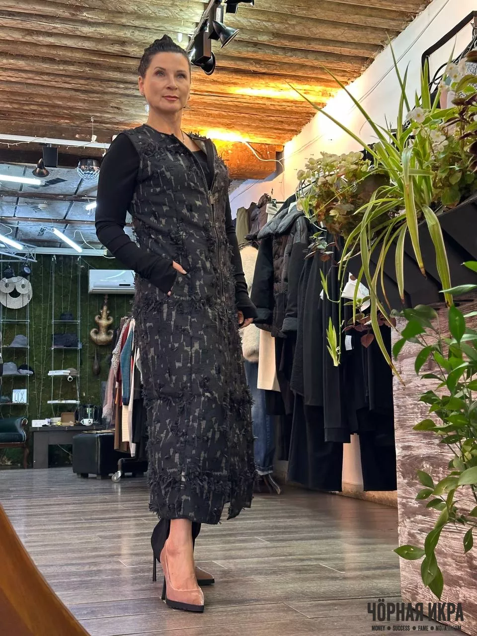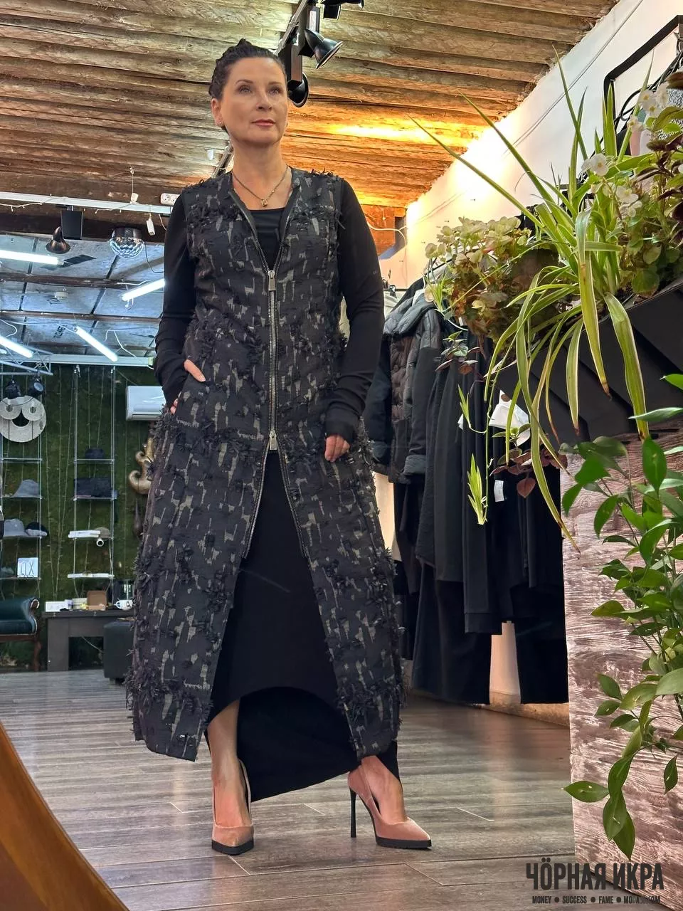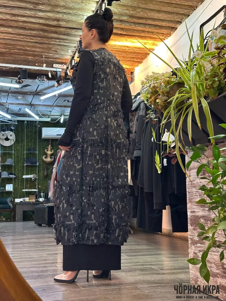 Основа композиции — жилет от итальянского дизайнера Simona Tagliaferri. Это вещь-объект: сложная фактура из хлопка и полиакрила дополнена отделкой из натуральной кожи, создавая эффект брони, которая при этом остается удивительно пластичной. Под стать ему — лаконичное платье из вискозы, создающее идеальный черный холст для экспериментов.