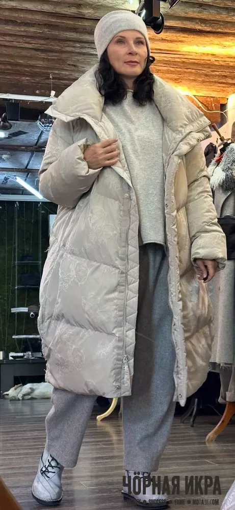 Светло-серый здесь работает как визуальная тишина. Нет конфликтов, нет крика — только мягкость, которая обнимает. Жаккардовый пуховик добавляет скрытую сложность, а ажурный шарф создаёт текстурный диалог.